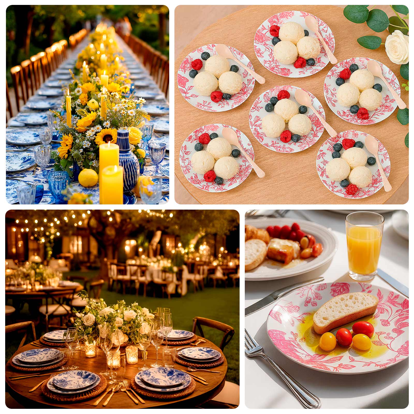10-Pack French Toile Plastic Party Plates – Blue & White Floral, 10" Round Disposable Dinner Plates
